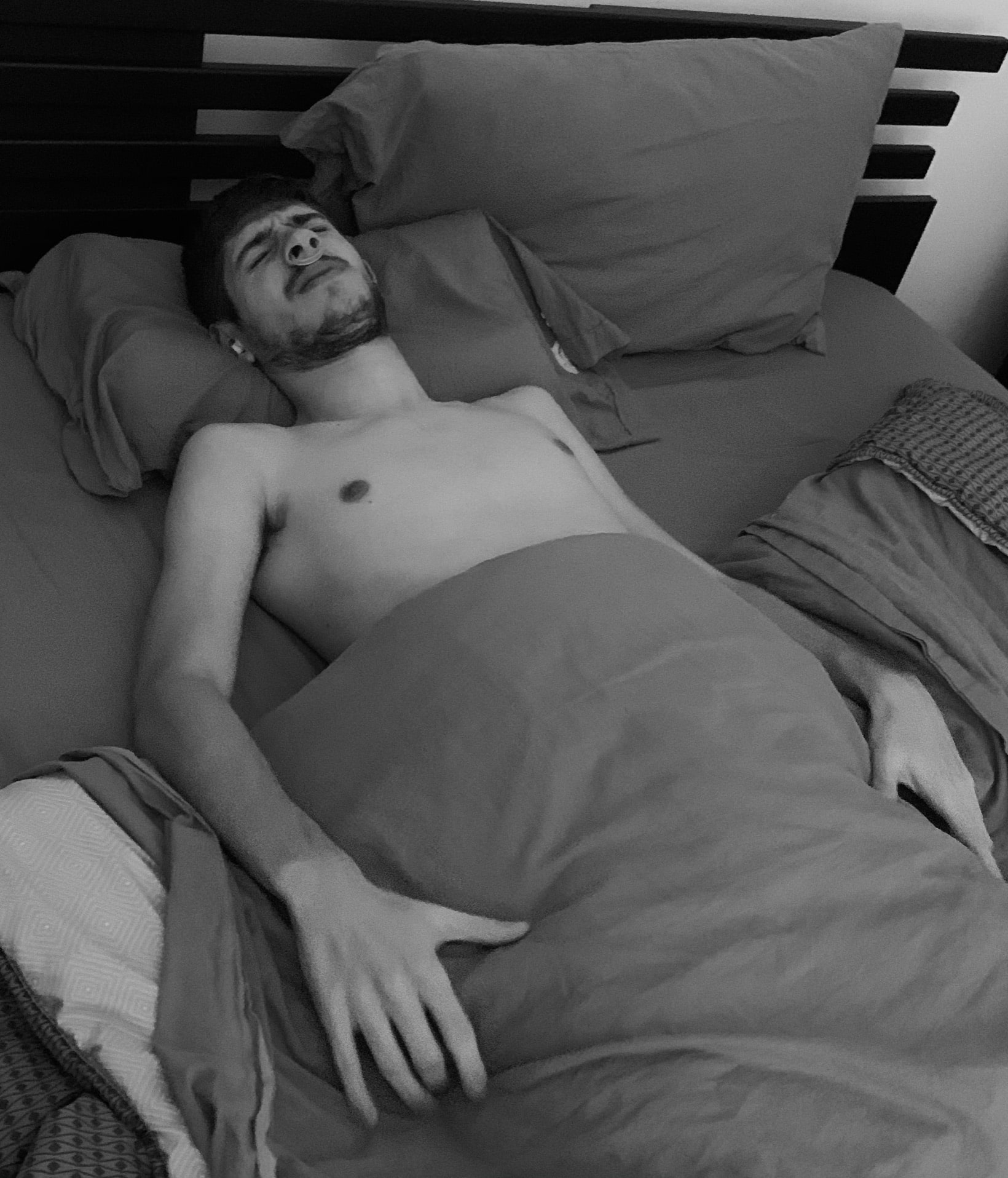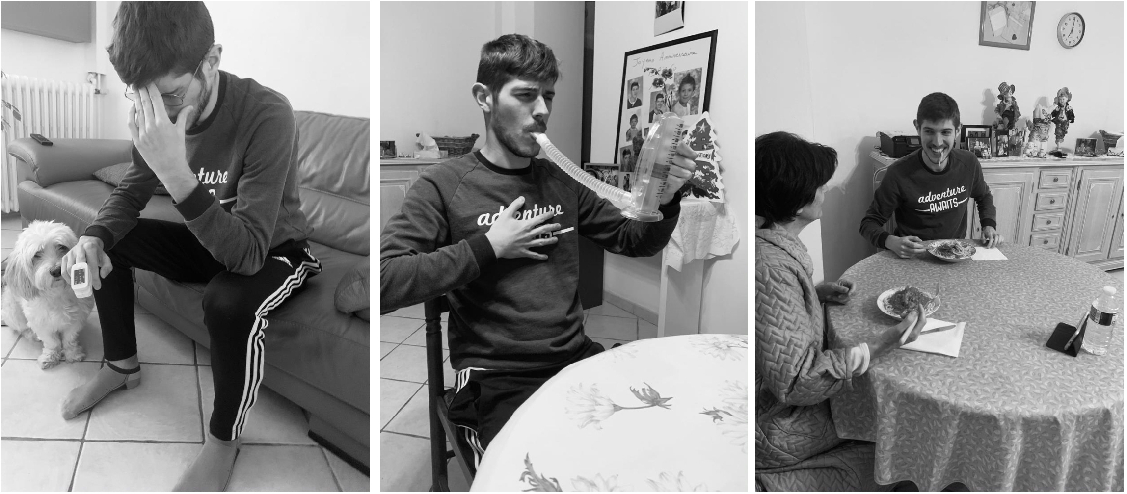 Parfois, dans la vie, on va d’un endroit à un autre géographiquement, mais aussi sur le plan affectif et psychologique. Le but est d’illustrer, avec plusieurs photos, une journée type du confinement. L’objectif de ce projet est de représenter une journée du réveil au coucher. La première image représente un réveil difficile et la dernière un sommeil qui s’annonce peu réparateur. La série de photographies est assez lourde de sens puisque prise durant le confinement national en novembre. Les photos sont authentiques, rien n’est surjoué. Elles représentent le véritable quotidien de ce jeune homme, en difficulté en tant qu’étudiant. Nous suivons donc le quotidien de celui-ci, composé de cours en distanciel, de rendez-vous médicaux chez le kinésithérapeute et d’angoisses. Les clichés sont assez difficiles à regarder, comme celle dans la douche où le mal-être est total.