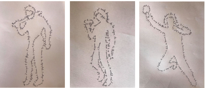 Nouvelle série de calligrammes sur le thème de la mythologie cette fois-ci, l’artiste ne précise pas les noms des dieux choisis, ni les textes formant les calligrammes en écho de son dernier travail où les indications gâchaient une partie du rendu. Cependant, la technique depuis le premier semestre n’a pas changé, simple dessin sur feuille.